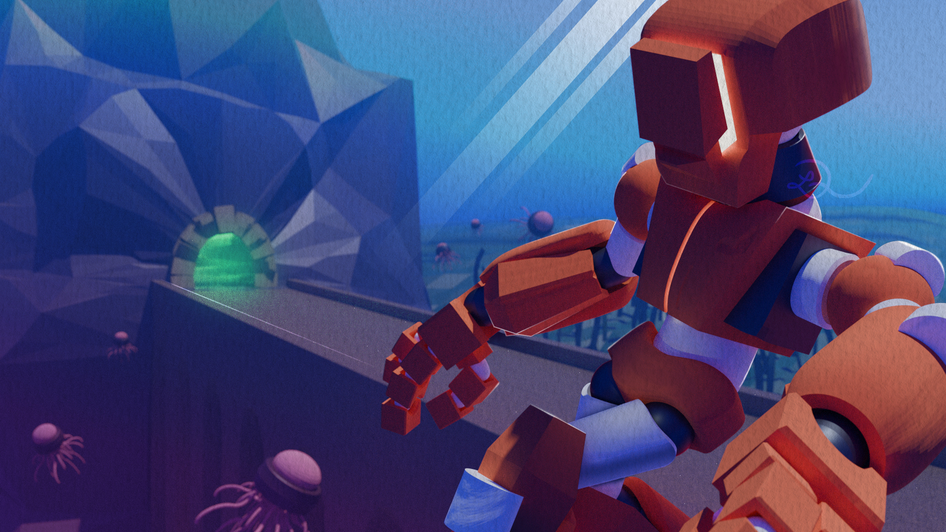 This is a piece of concept art I created in Blender for a world-building competition (Christian Faber’s Rebel Nature), where I designed a robot and its environment, and assembled a composition that I rendered.